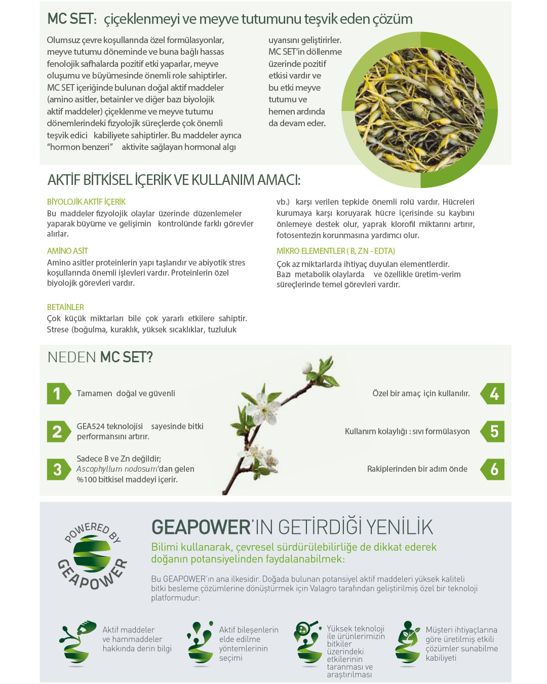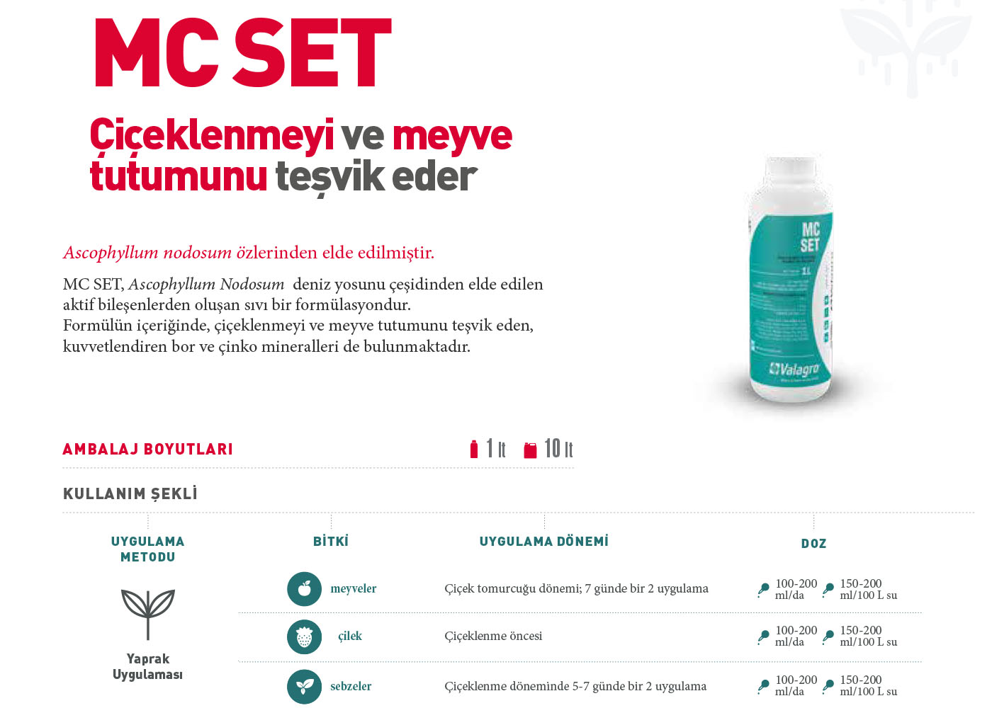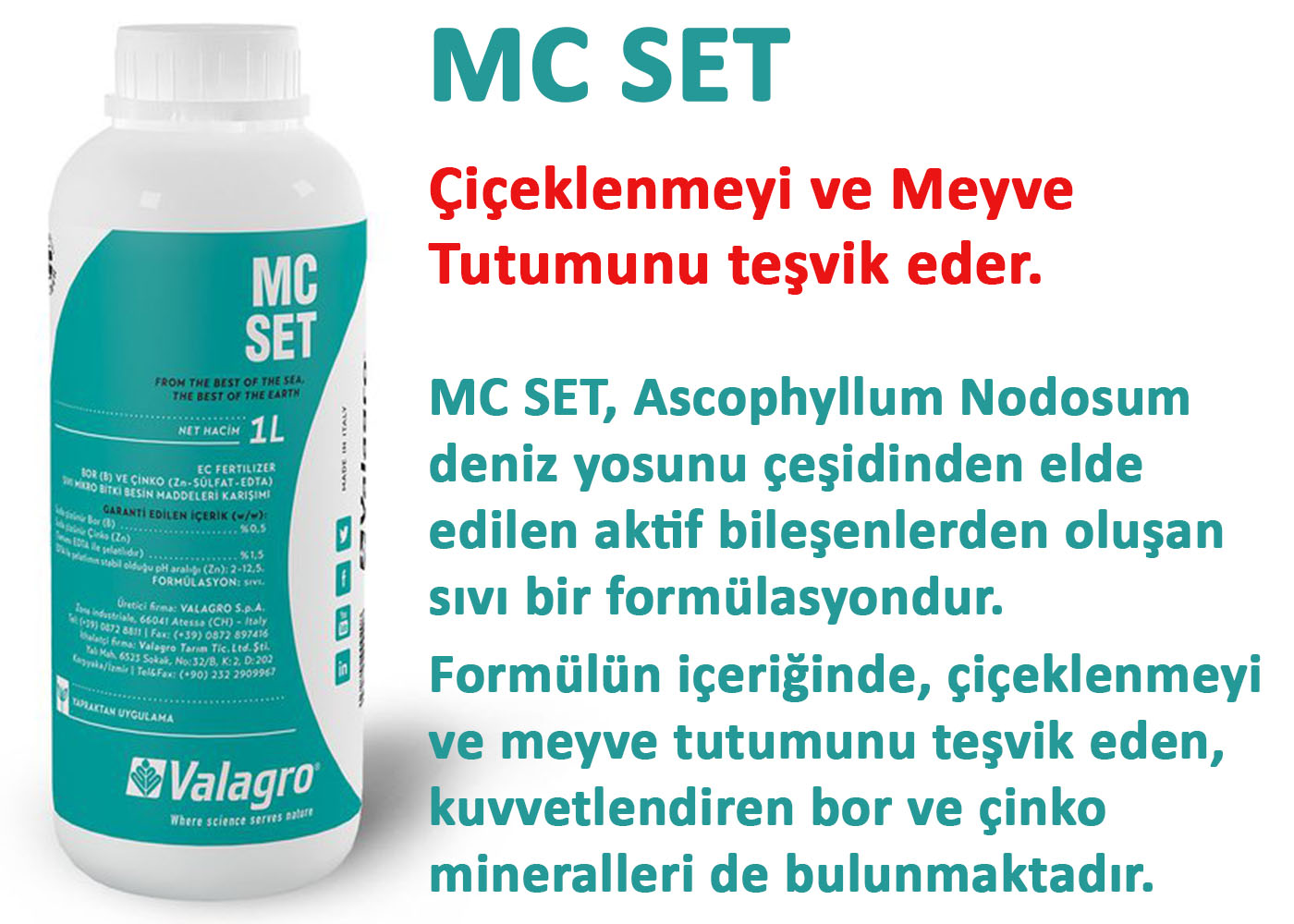 MC SET, Ascophyllum Nodosum deniz yosunu çeşidinden elde edilen aktif bileşenlerden oluşan sıvı bir formülasyondur. Formülün içeriğinde, çiçeklenmeyi ve meyve tutumunu teşvik eden, kuvvetlendiren bor ve çinko mineralleri de bulunmaktadır.