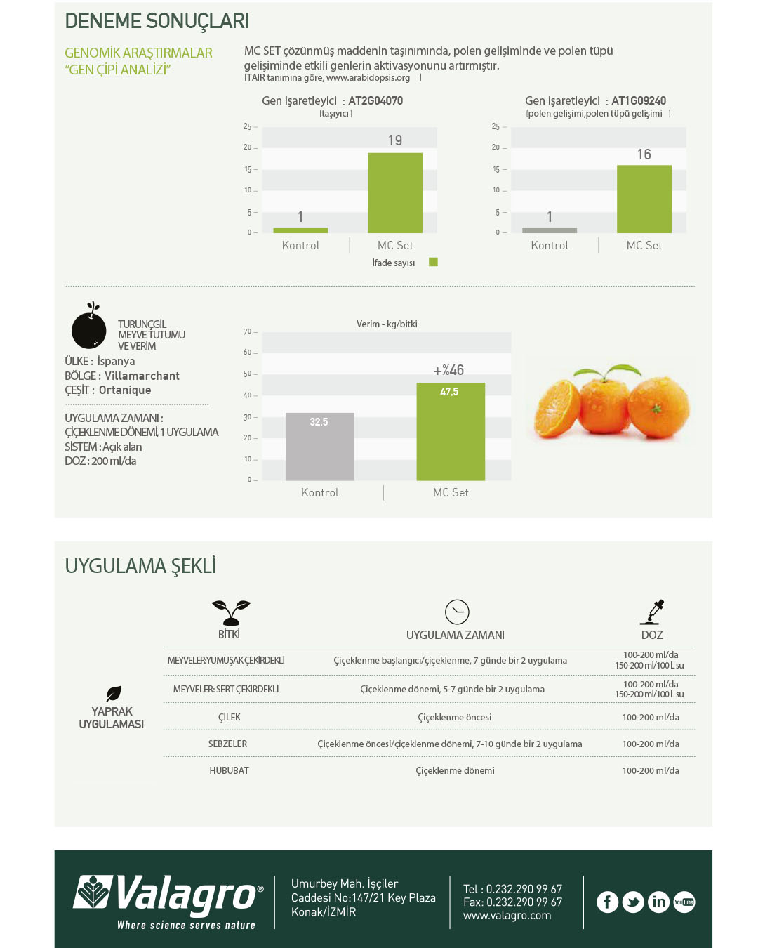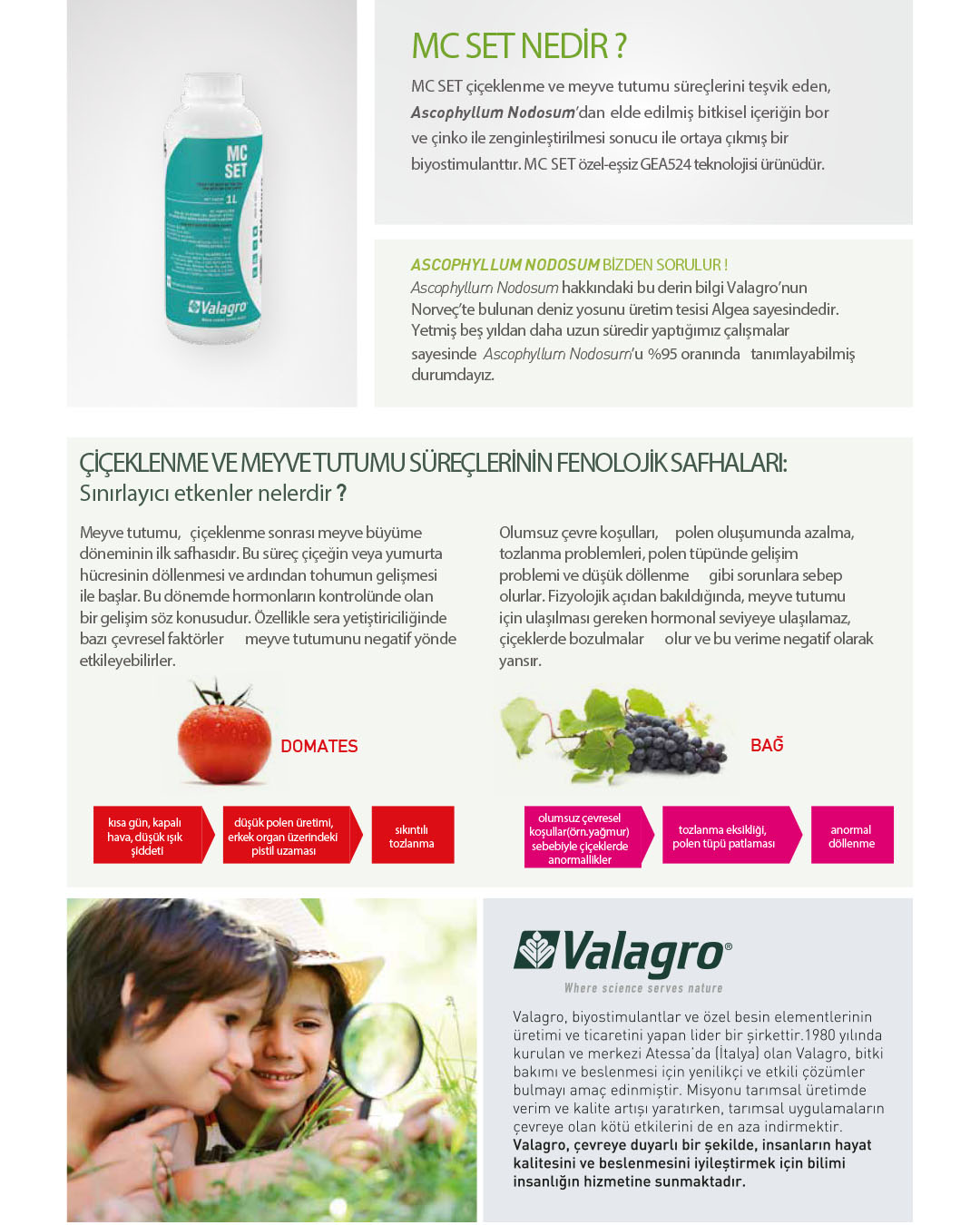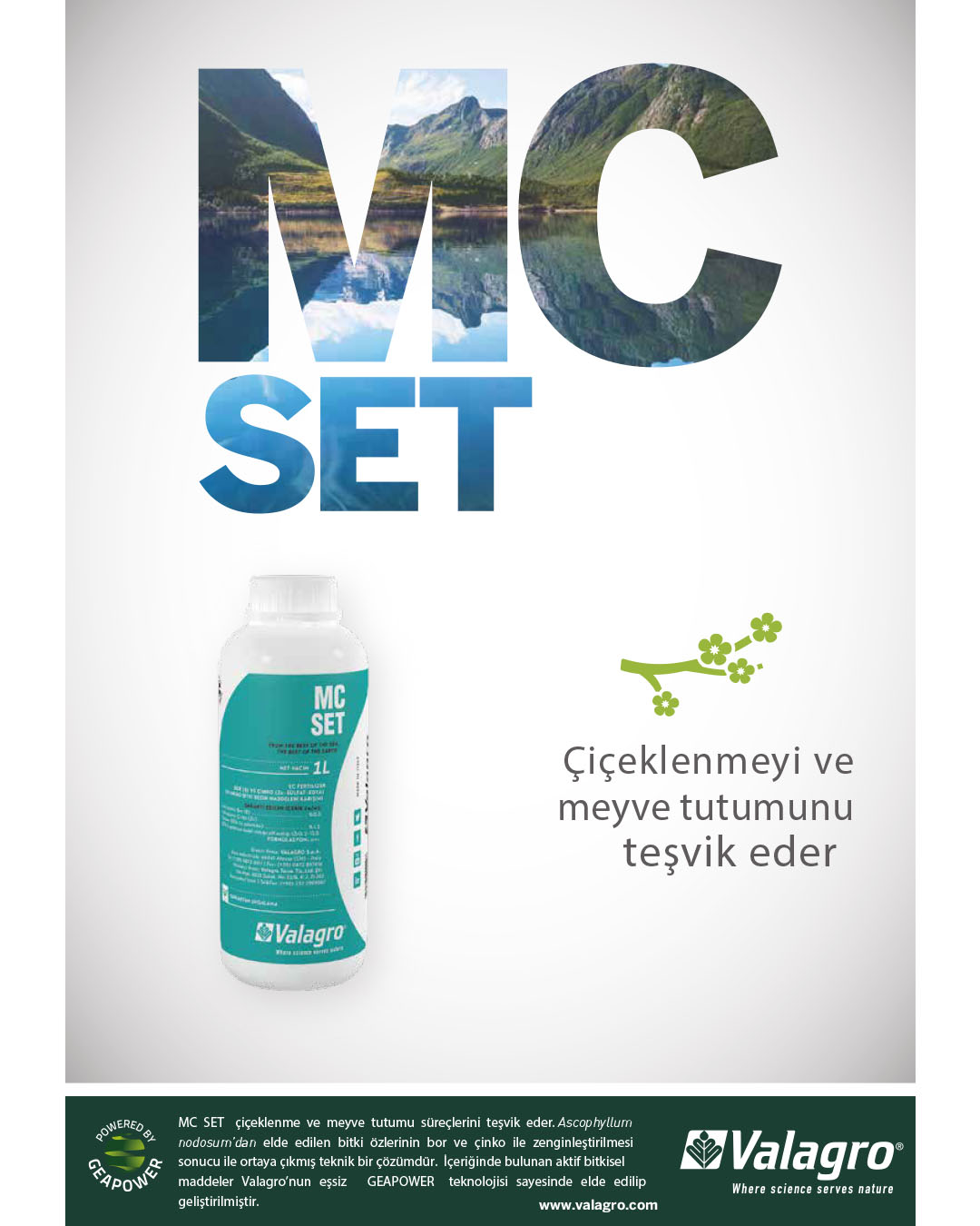 MC SET, Ascophyllum Nodosum deniz yosunu çeşidinden elde edilen aktif bileşenlerden oluşan sıvı bir formülasyondur. Formülün içeriğinde, çiçeklenmeyi ve meyve tutumunu teşvik eden, kuvvetlendiren bor ve çinko mineralleri de bulunmaktadır.
